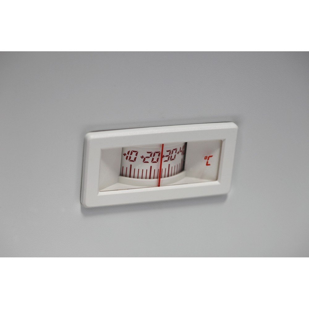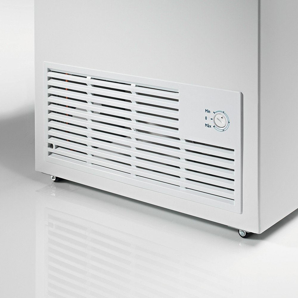 El arcón congelador dispone de termostato ajustable, termómetro mecánico y luz. Incluye cierre con llave y 2 cestas.